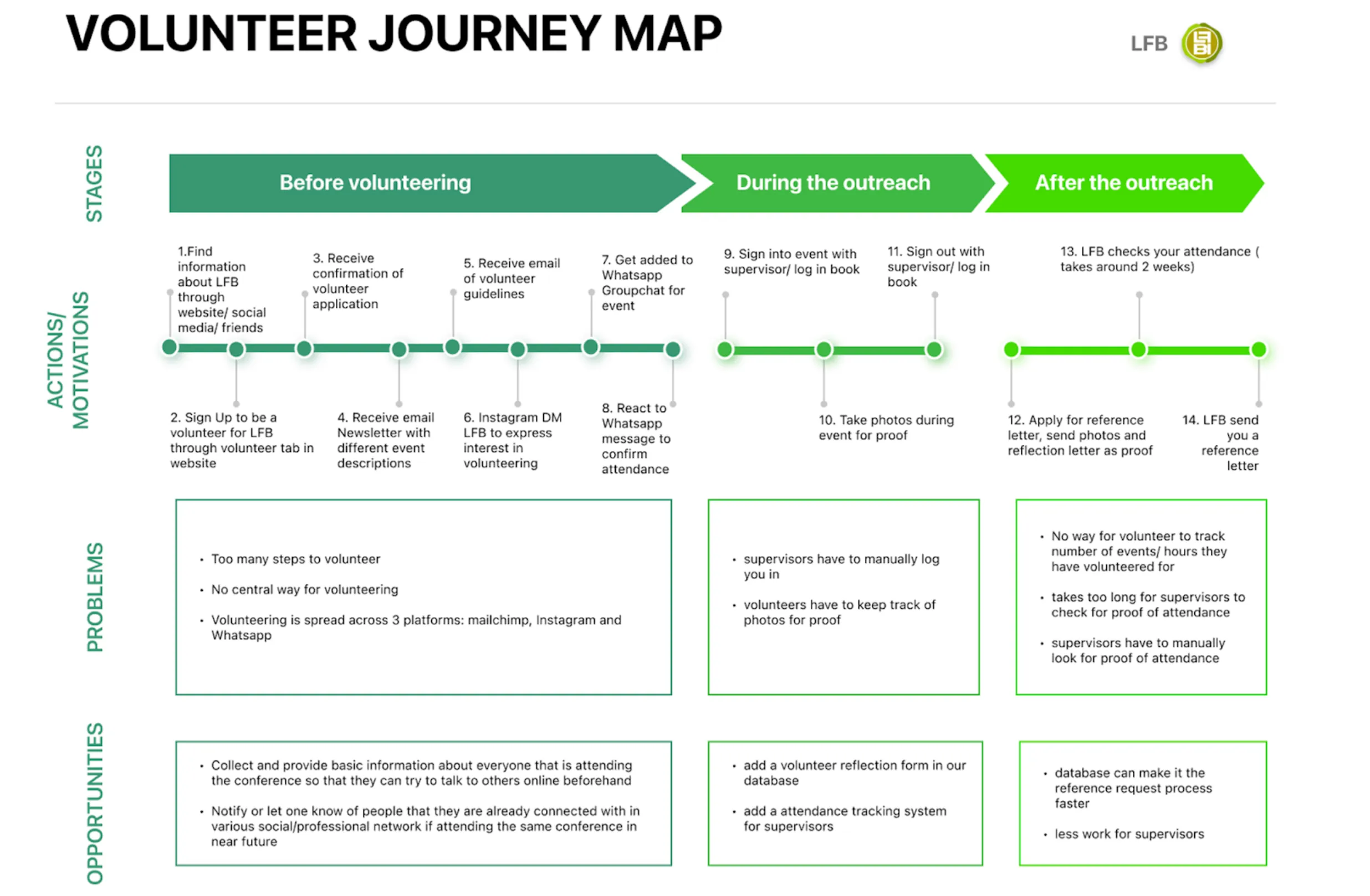 After we finalized the user flow we also made a journey map for the volunteers. This helped us reiterate what problems arose at each step of volunteering for LFBI. This really helped us with visualizing the problems, and helped us brainstorm on how we might solve these issues.